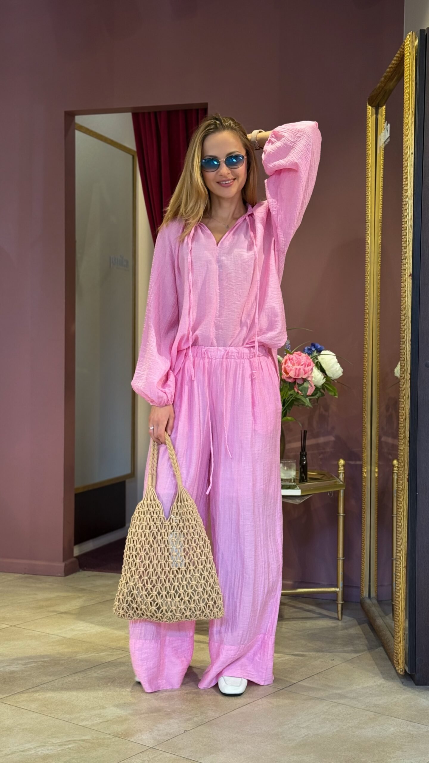 Puikiai dera su ta pačia rožine palaidine kaip komplektas, baltu topu ar marškinėliais. Labai patogus ir vasariškas pasirinkimas kasdienai.