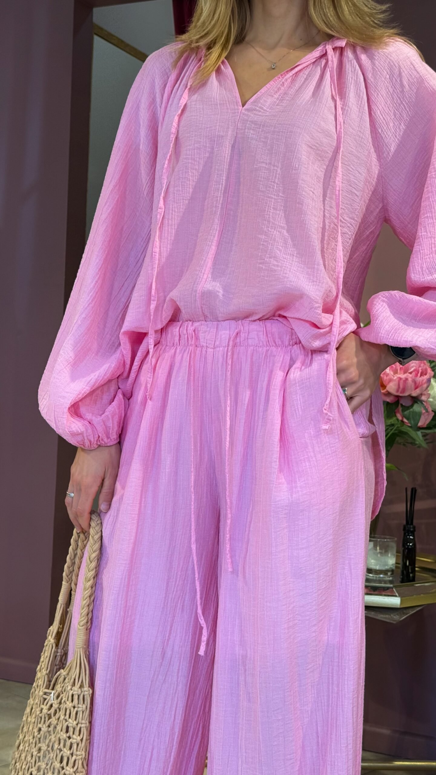 Patogios, laisvo kirpimo plačios kelnės ryškioje baby pink spalvoje. Audinys su maloniu „glamžimo” efektu, aukštas elastingas juosmuo su raišteliais ir gilios kišenės šonuose. Kelnės lengvai krenta ir suteikia lengvą, bet stilingą siluetą. Taip pat kelnės yra su pamušalu.