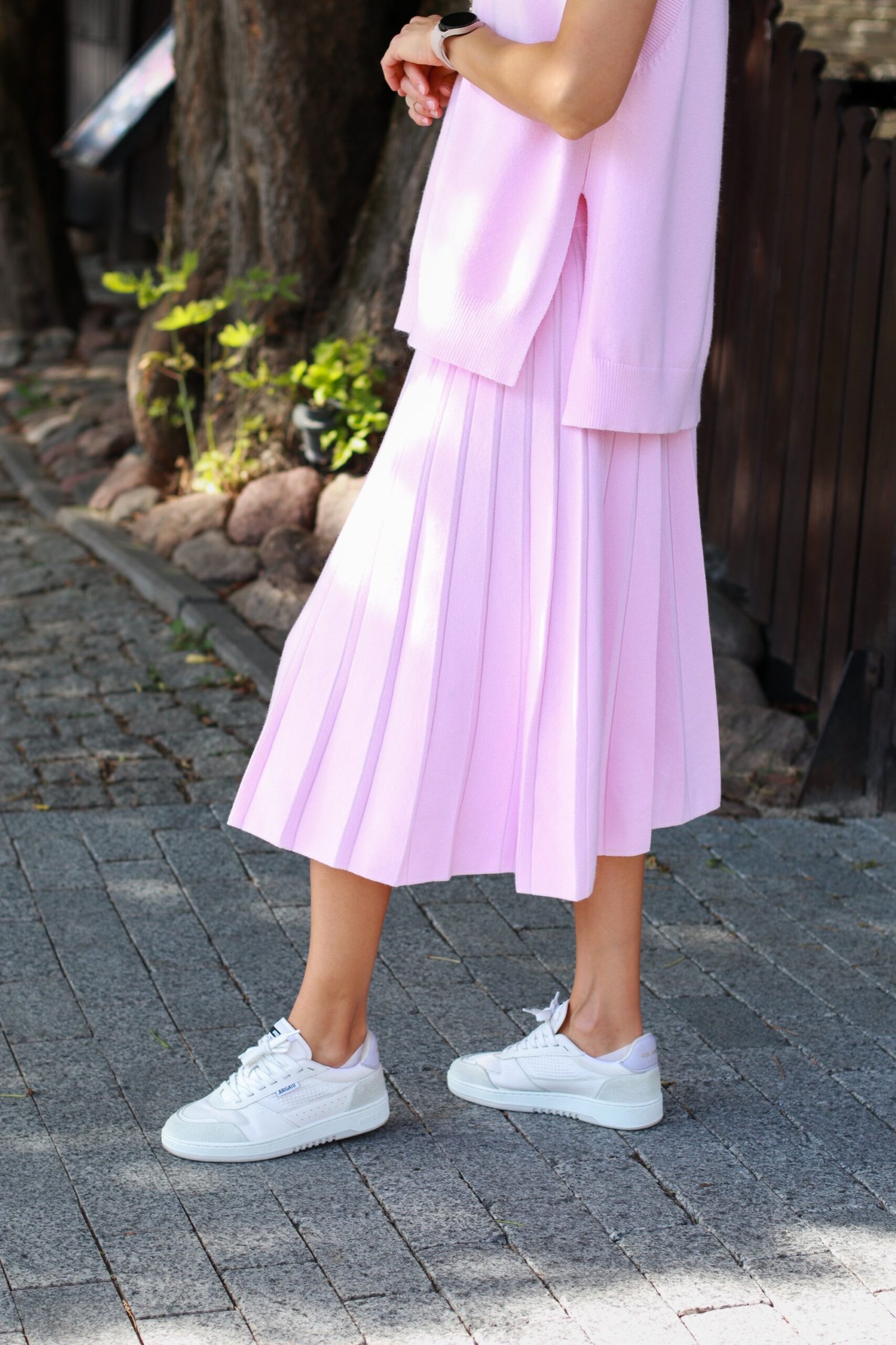 Švelniai rožinės spalvos klostuotas sijonas – tikras moteriškumo ir elegancijos įsikūnijimas. Jo klasikinė midi ilgio forma sukuria lengvą judesio dinamiką, o klostės suteikia subtilaus žaismingumo ir išraiškingumo.