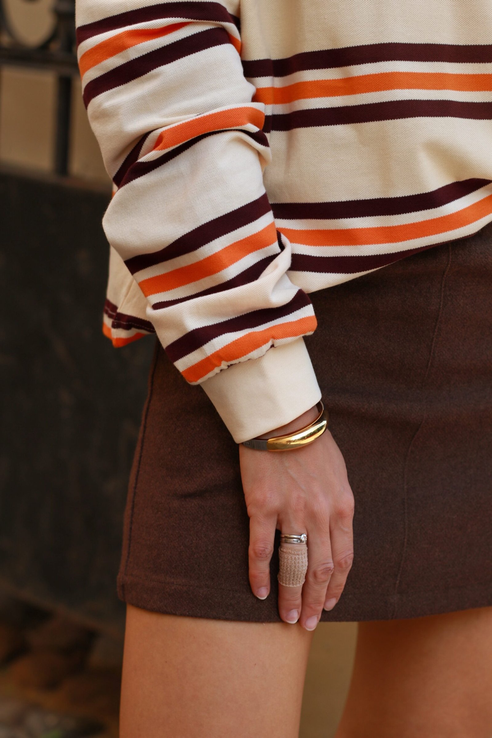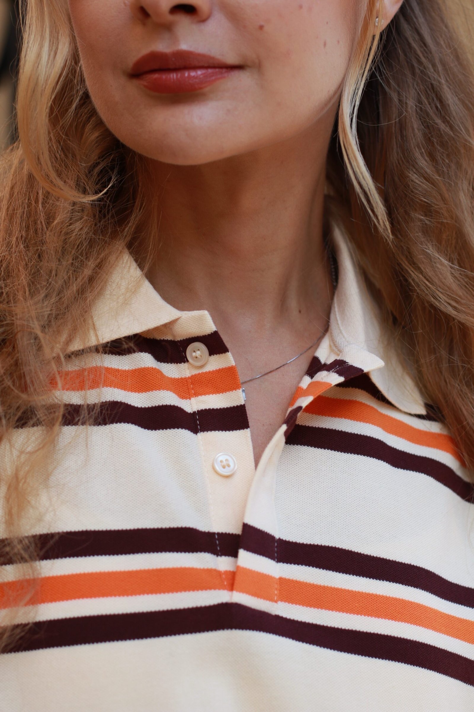 Ši stilinga dryžuota palaidinė įkvėpta retro estetikos, tačiau pritaikyta šiuolaikiniam įvaizdžiui. Pagaminta iš malonaus, kvėpuojančio audinio, ji suteikia komfortą visą dieną. Smėlio spalvos pagrindas harmoningai dera su sodriais rudais bei ryškiais oranžiniais dryžiais, kurie suteikia žaismingumo ir energijos.