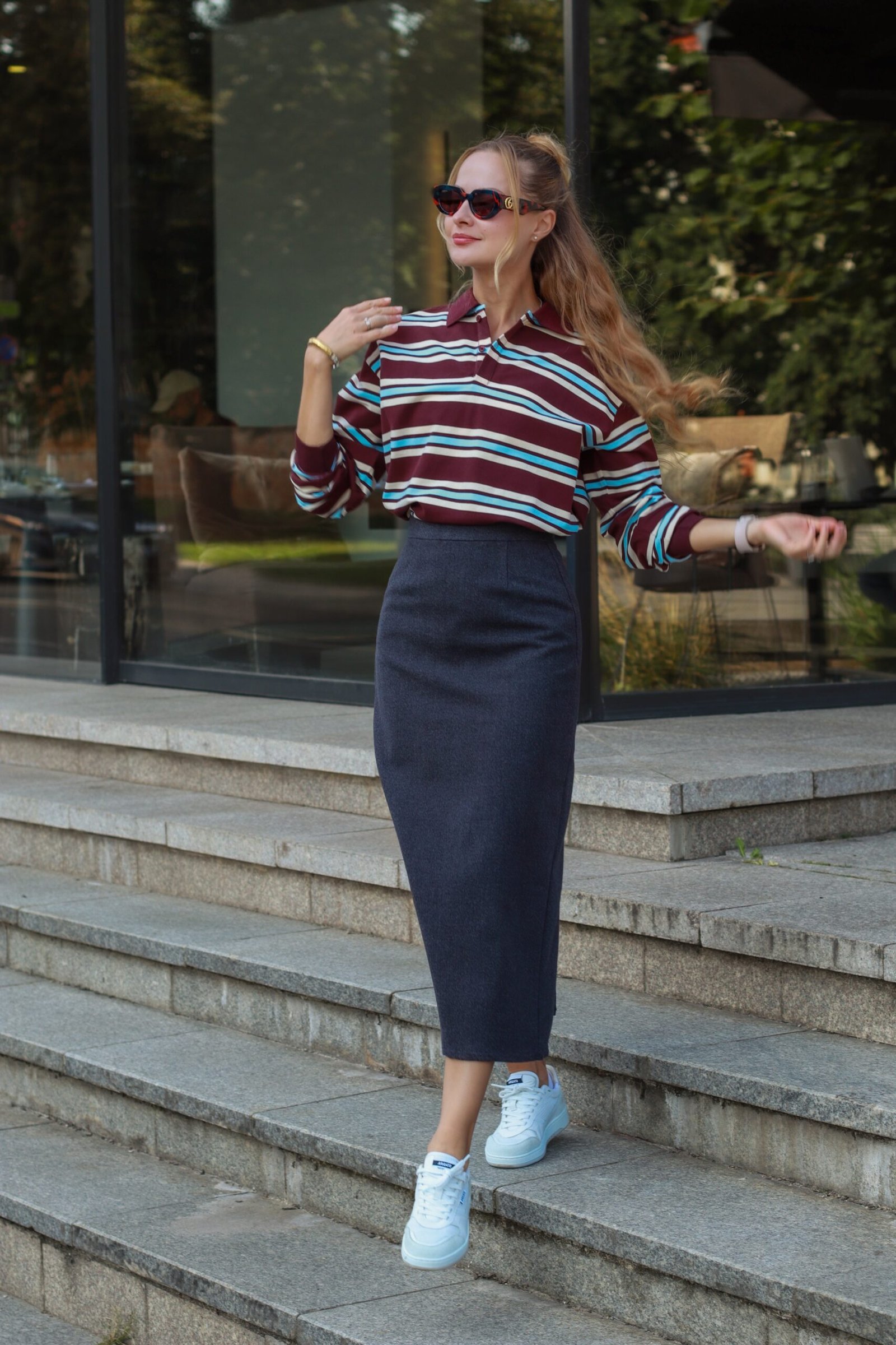 Ši stilinga dryžuota palaidinė įkvėpta retro estetikos, tačiau pritaikyta šiuolaikiniam įvaizdžiui. Pagaminta iš malonaus, kvėpuojančio audinio, ji suteikia komfortą visą dieną. Bordo spalvos pagrindas harmoningai dera su sodriais baltais bei melsvais dryžiais, kurie suteikia žaismingumo ir energijos.