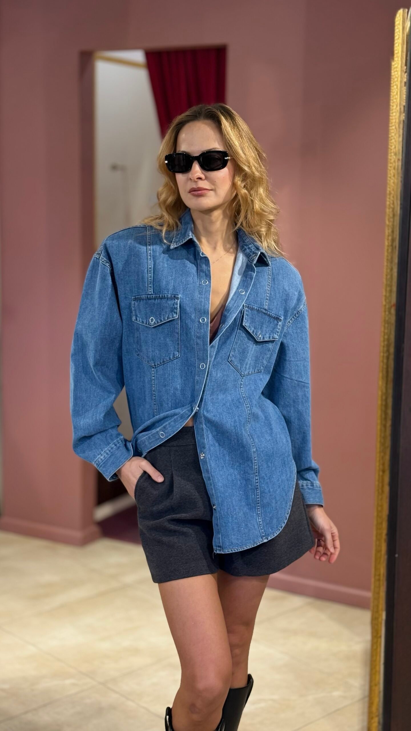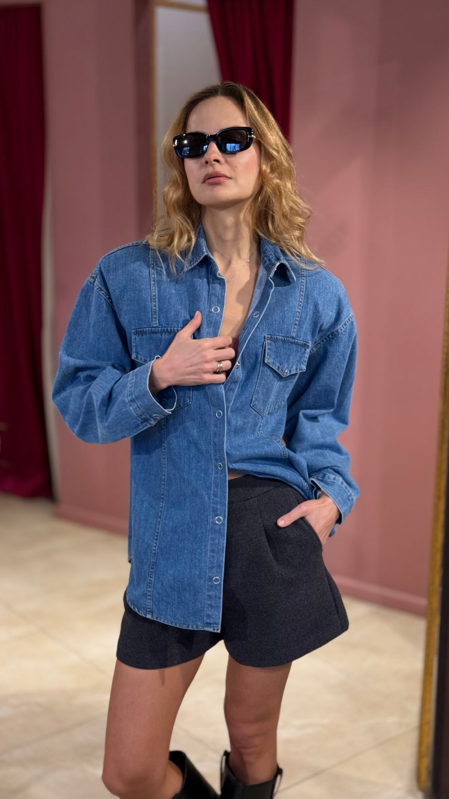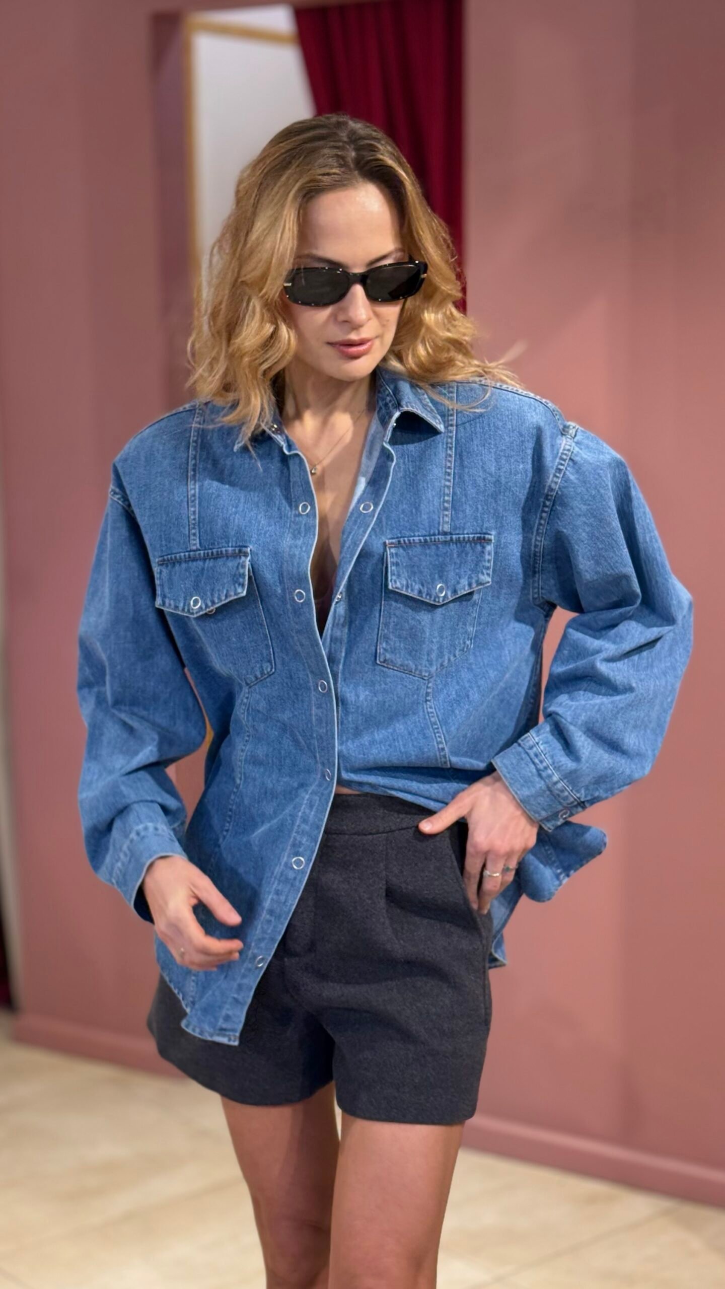 Moderni klasika su charakteriu. Šie džinsiniai marškiniai sujungia laisvą „oversize“ siluetą ir struktūruotą formą, kurią suteikia nusegami petukai. Vieną dieną – minimalistiniai ir kasdieniški, kitą – ryškesnio silueto, madingi ir drąsūs.