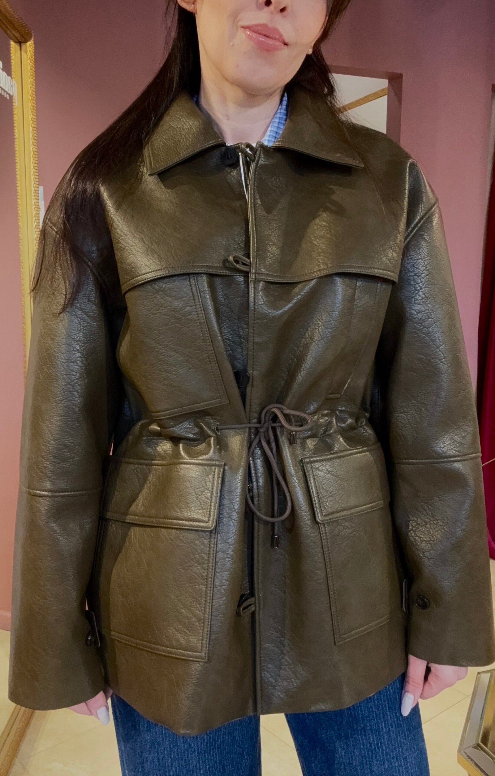 Šis eko odos švarkelis – tas vienas sluoksnis, kuris akimirksniu „surinks“ visą įvaizdį. Struktūriškas siluetas, subtilus blizgesys ir reguliuojamas liemuo sukuria labai dailią figūros liniją – gali nešioti laisvai arba suveržti ir išgauti moteriškesnį siluetą.