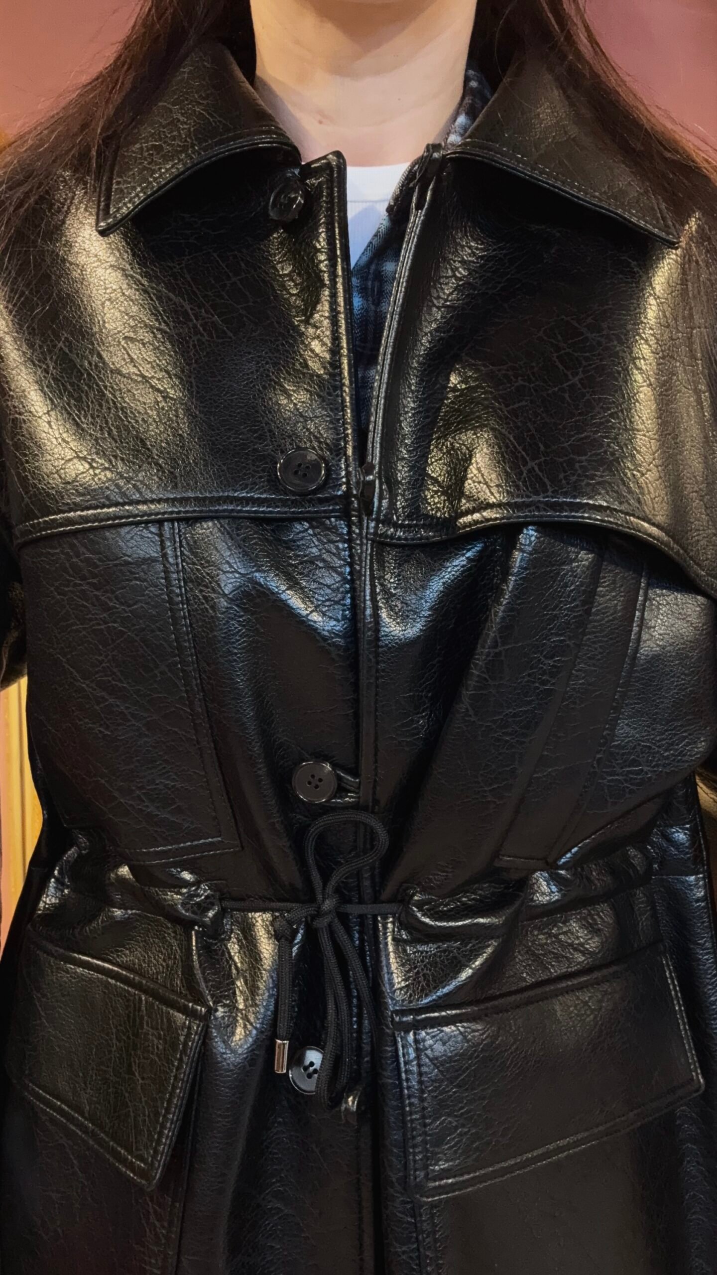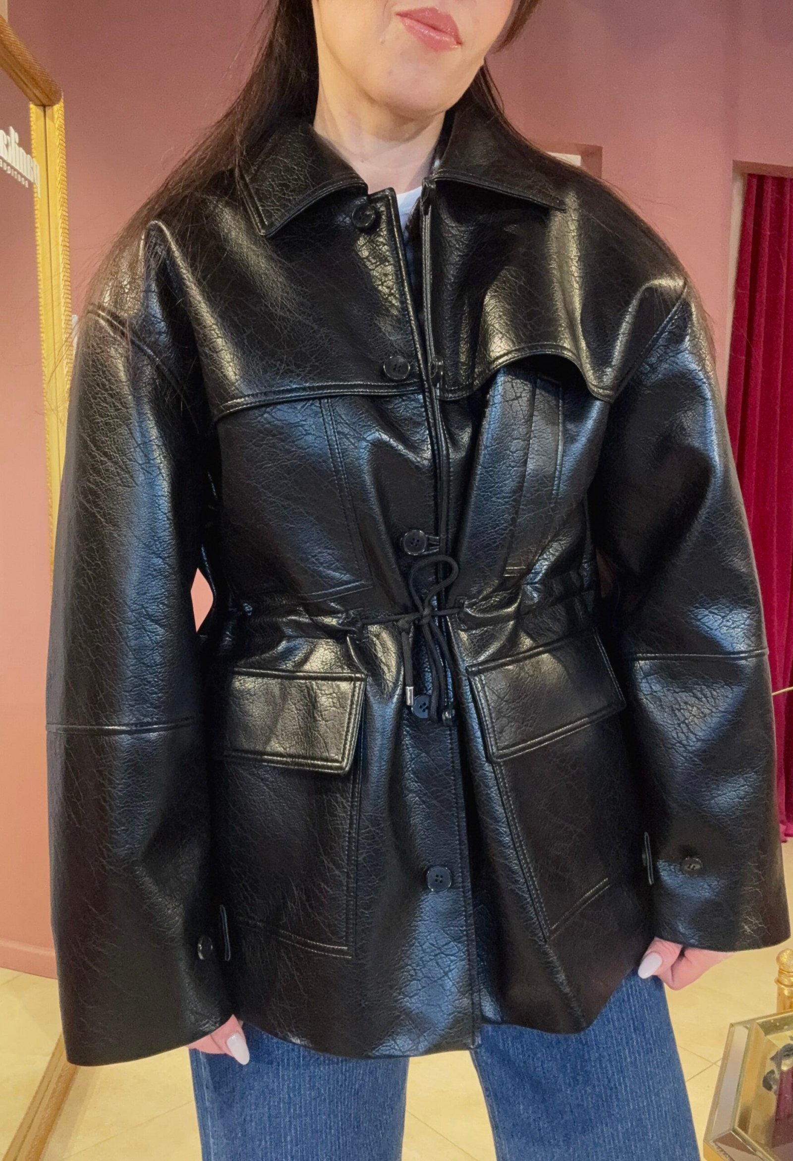 Šis eko odos švarkelis – tas vienas sluoksnis, kuris akimirksniu „surinks“ visą įvaizdį. Struktūriškas siluetas, subtilus blizgesys ir reguliuojamas liemuo sukuria labai dailią figūros liniją – gali nešioti laisvai arba suveržti ir išgauti moteriškesnį siluetą.