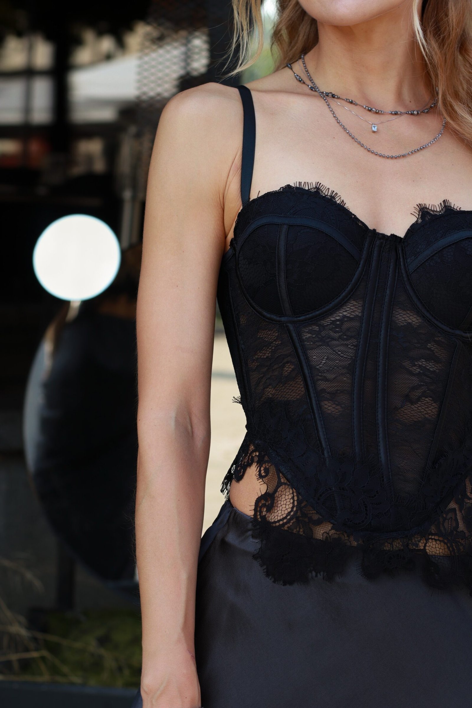 Šis juodos spalvos korsetas su petnešėlėmis – tobula detalė, suteikianti rafinuotumo bet kuriam įvaizdžiui. Kruopščiai priglundantis dizainas formuoja dailų siluetą, o subtilus audinys pabrėžia moteriškumą bei suteikia modernios prabangos.