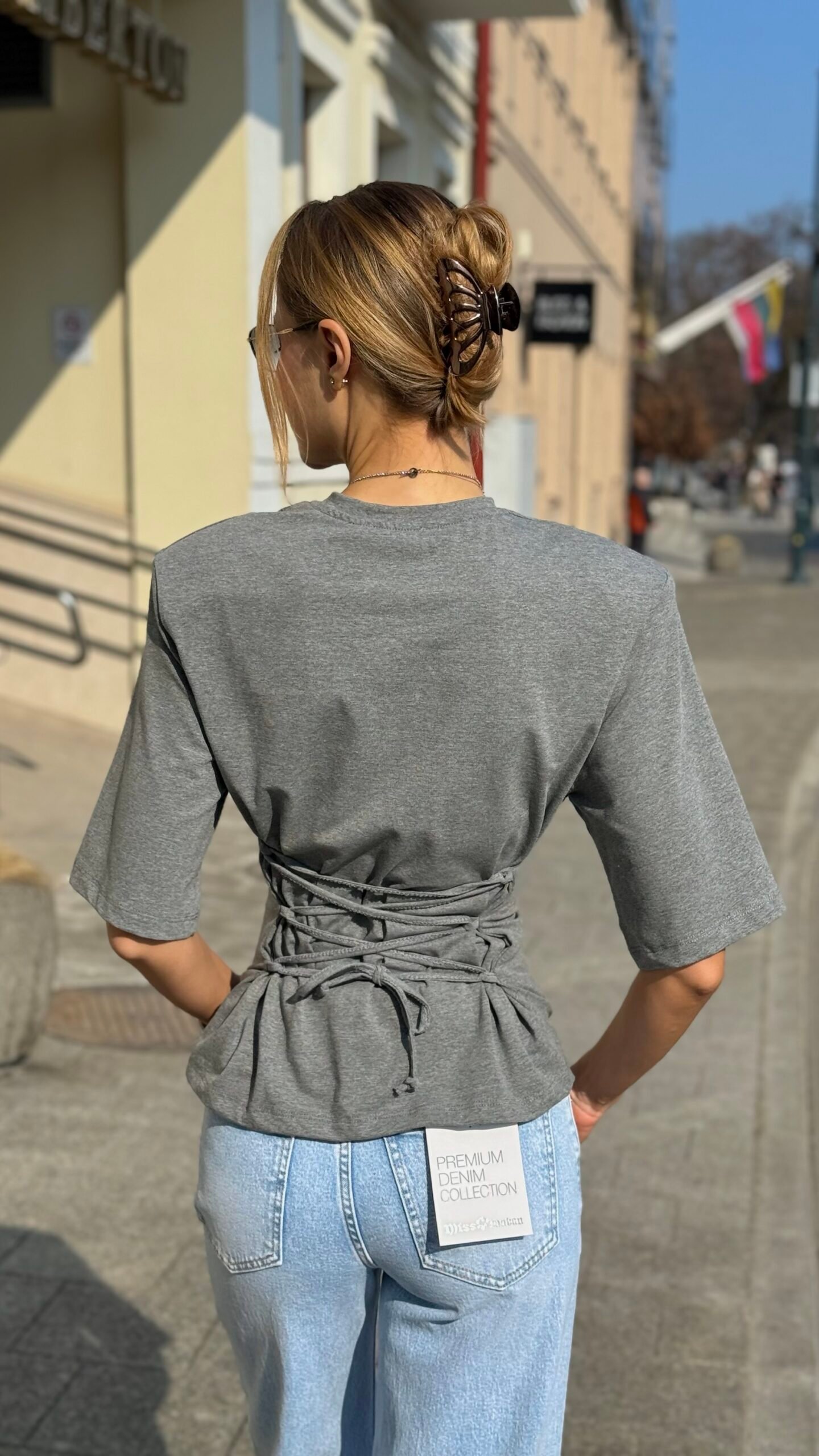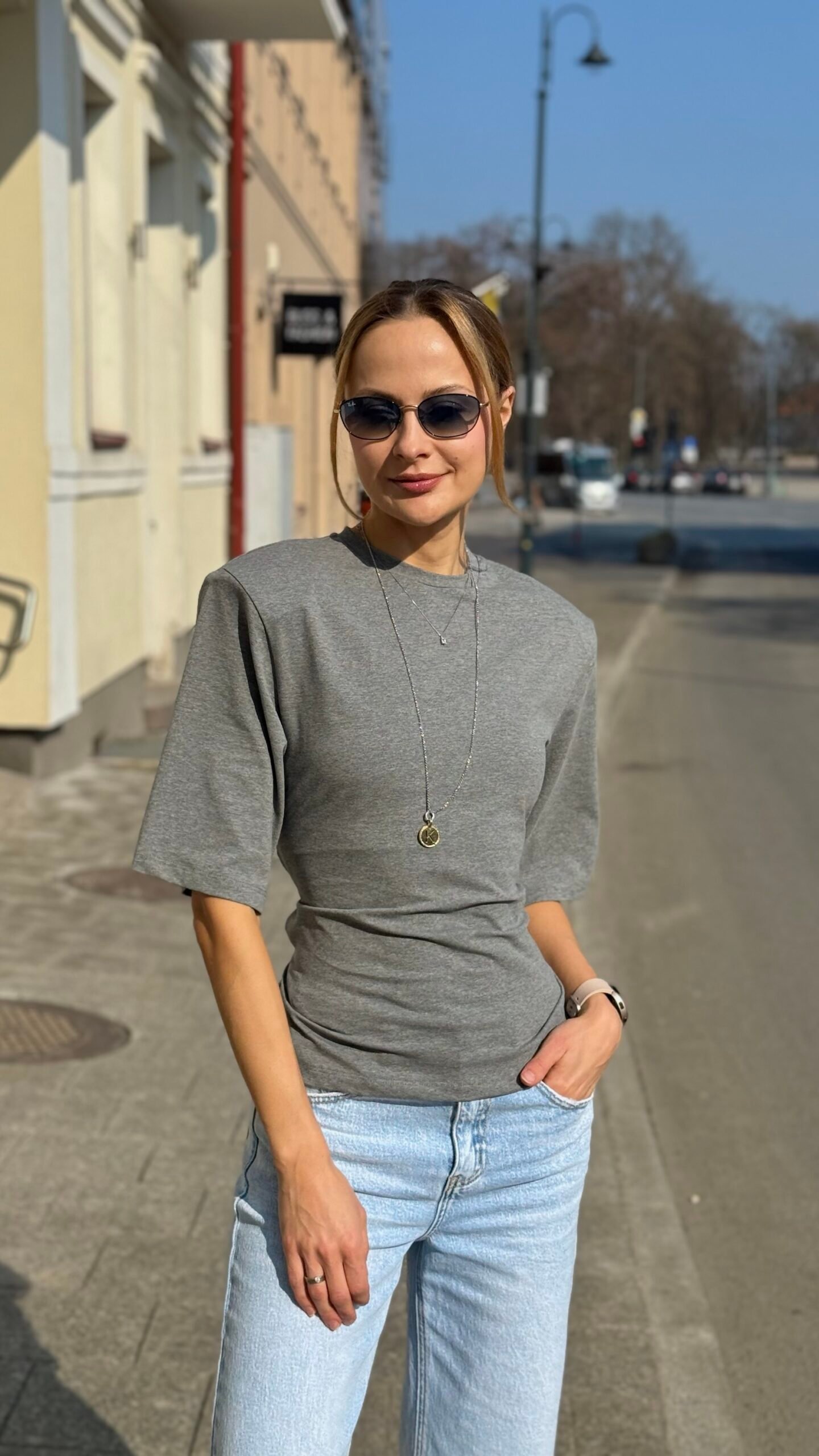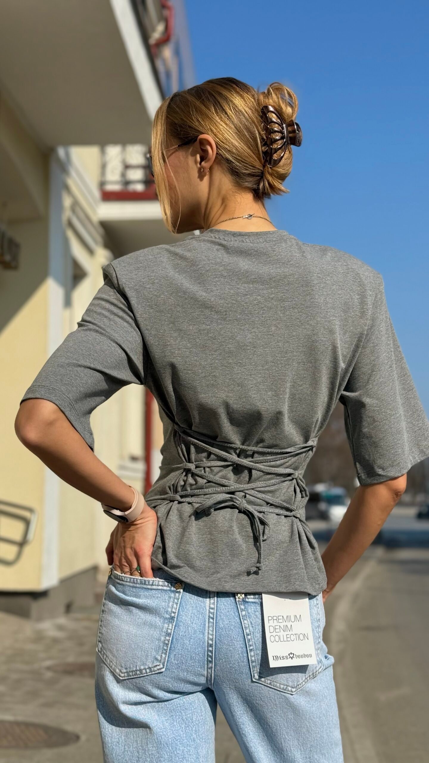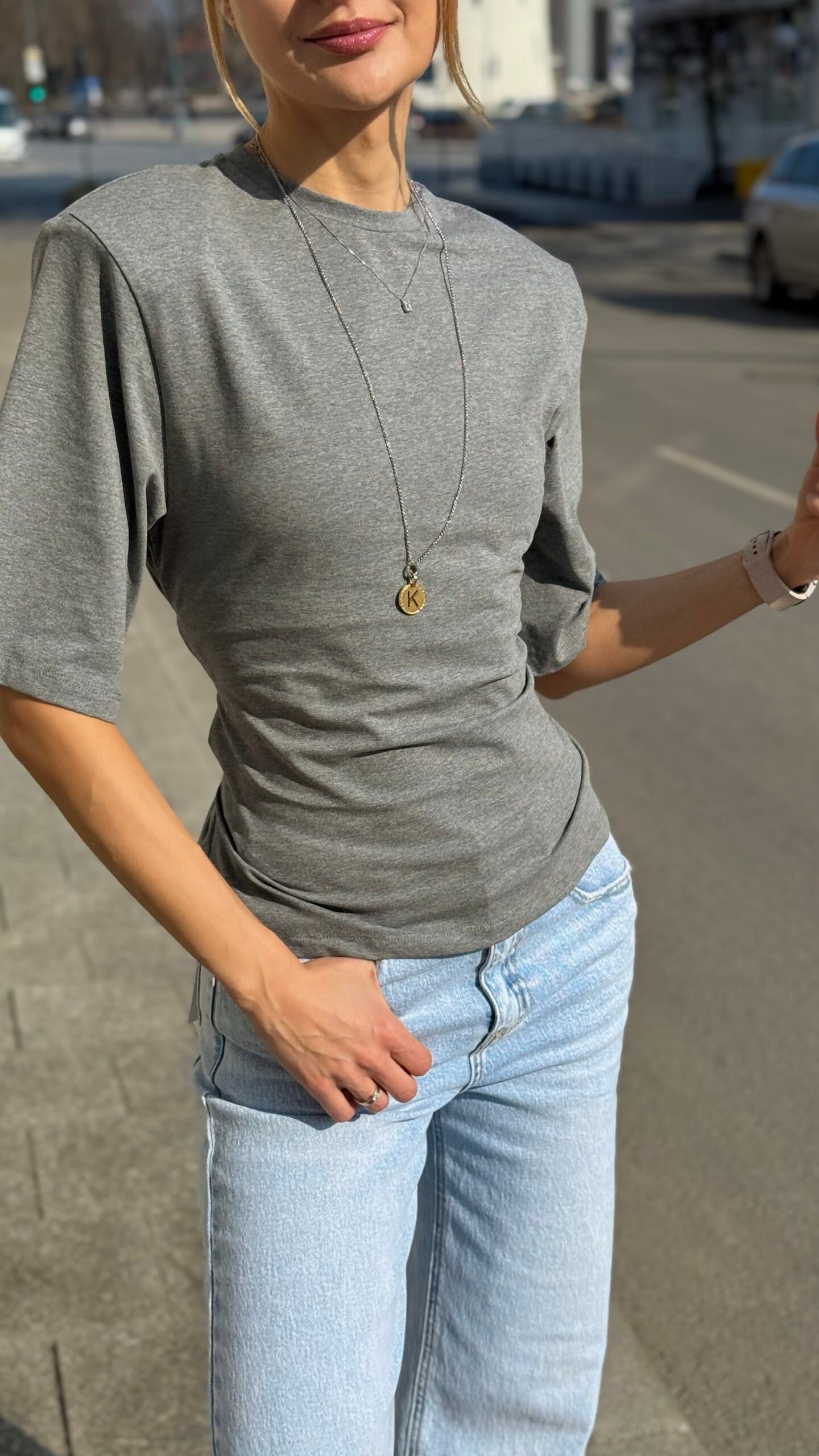 Neutrali, lengvai derinama pilka spalva ir modernus siluetas – trumpa palaidinė su ¾ rankovėmis, suvarstoma per liemenį virvele, kuri gražiai suformuoja figūrą. Minkštas, elastingas audinys maloniai priglunda. Puikiai atrodo su aukšto liemens džinsais, plačiomis kelnėmis ar sijonu – lengvai pereina iš kasdienybės į vakarinį įvaizdį. Raišteliai nugaroje reguliuojasi pagal jūsų norus.