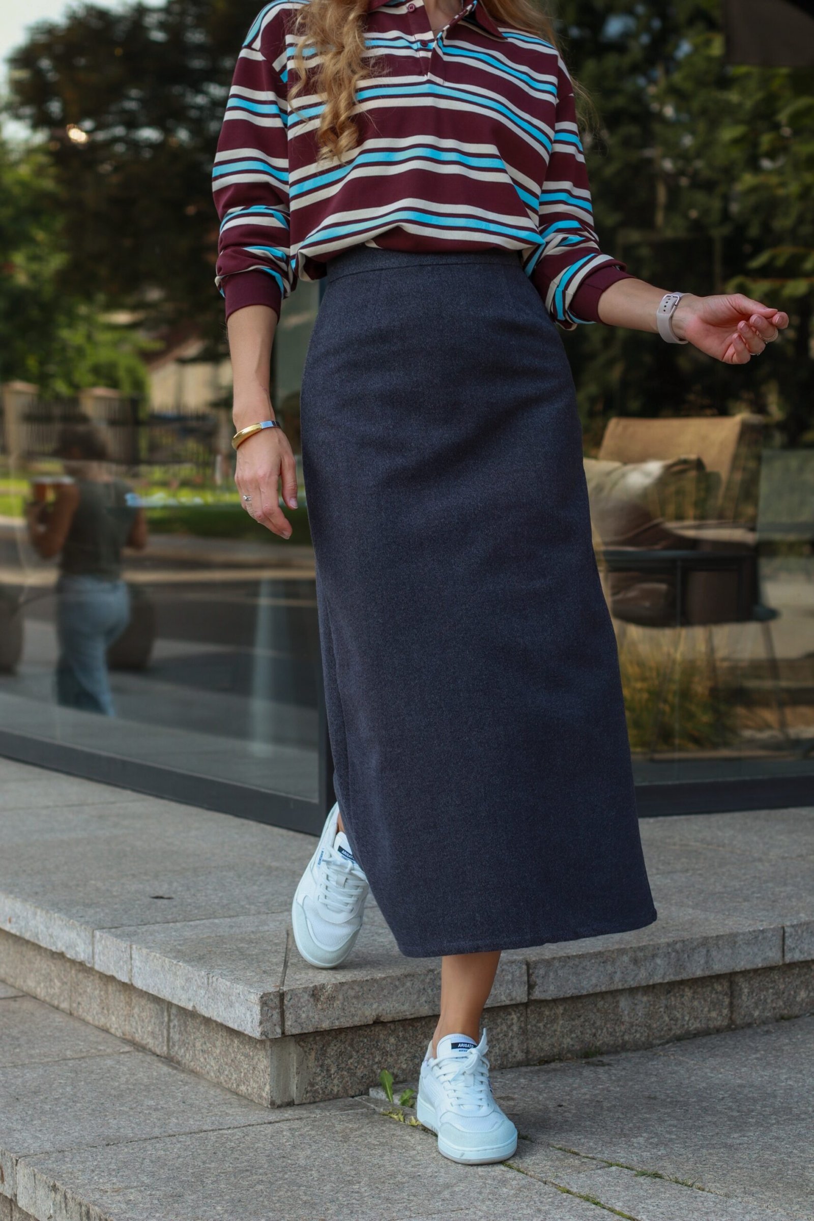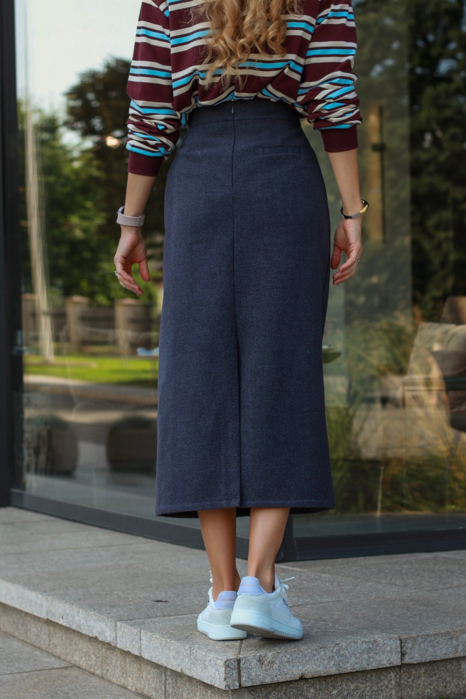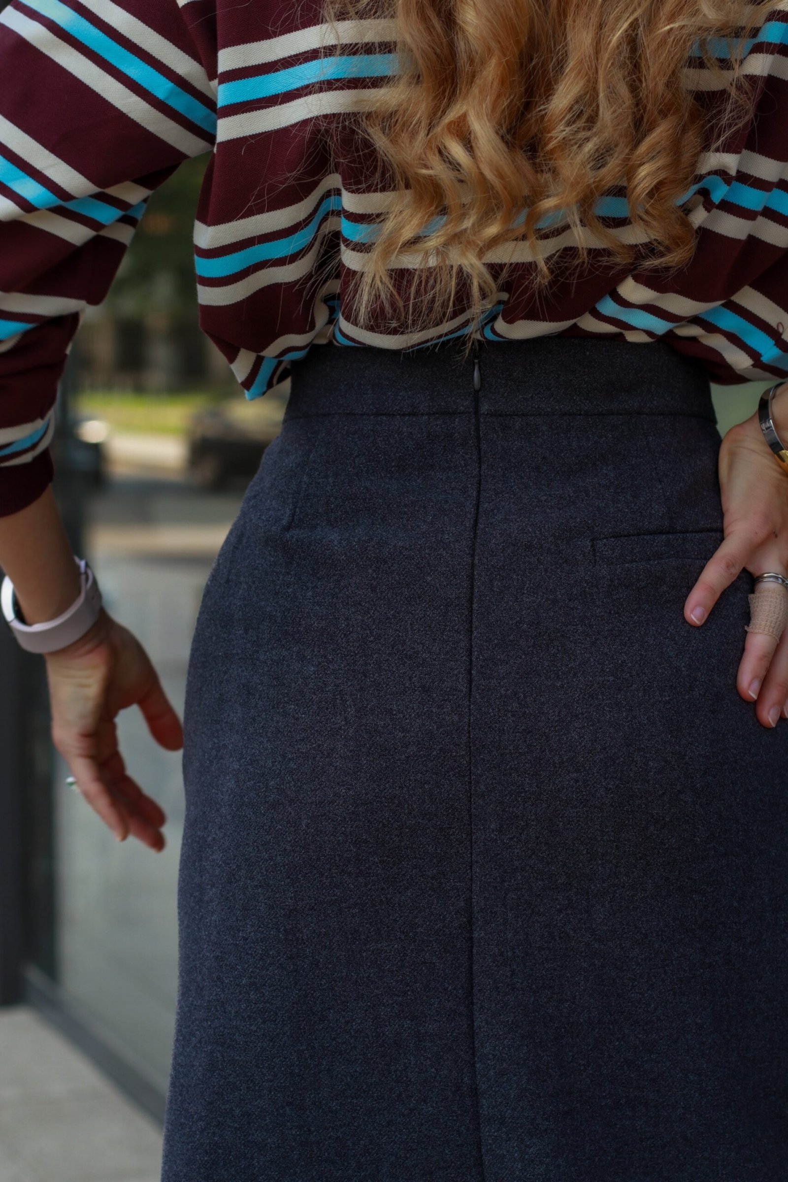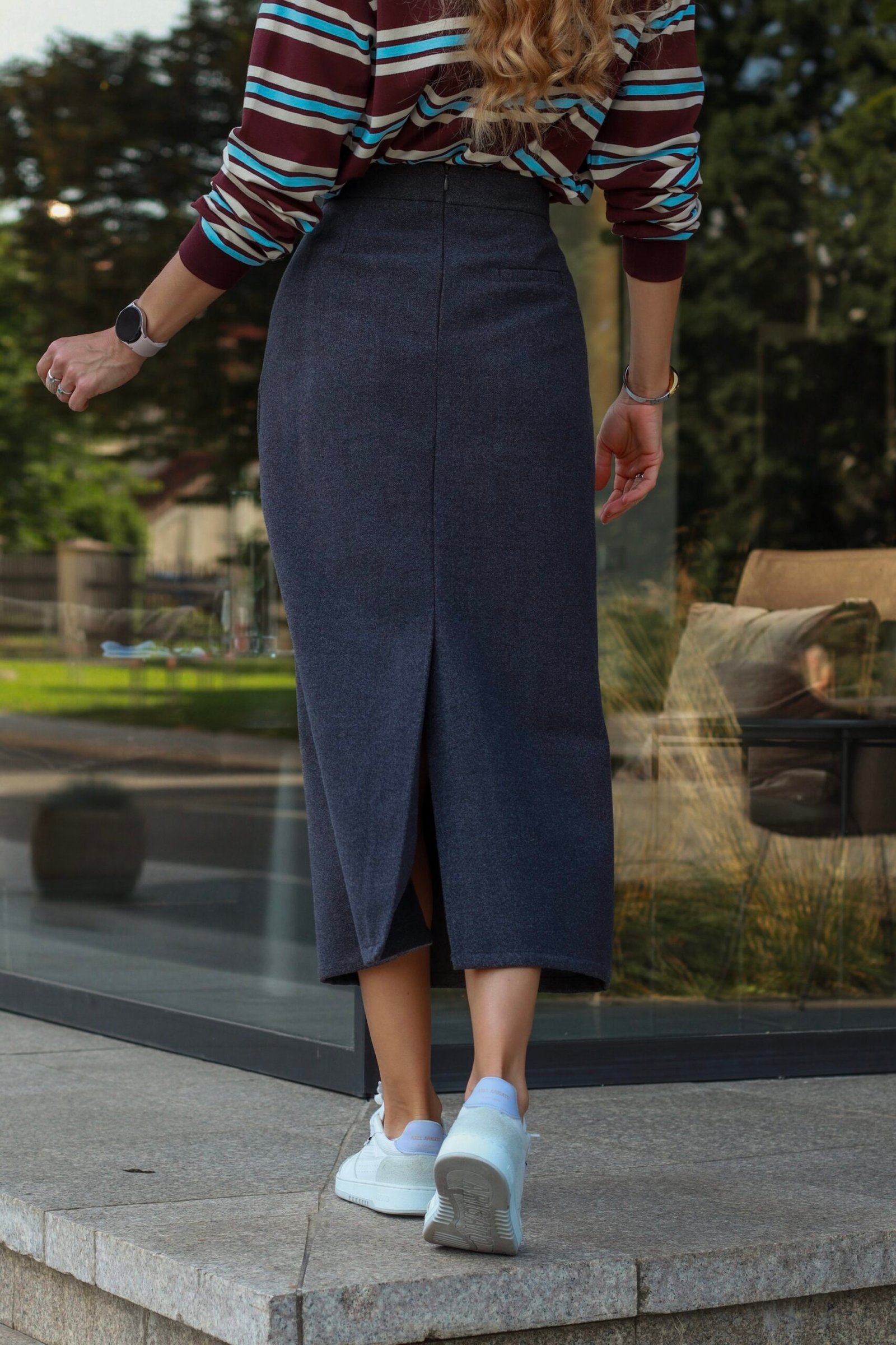 Klasika, kuri niekada neišeina iš mados – tamsiai pilkas midi ilgio sijonas. Tiesaus kirpimo, elegantiškai pabrėžiantis figūrą ir puikiai tinkantis tiek kasdienai, tiek ypatingoms progoms. Nugaros srityje esantis skeltukas suteikia patogumo judant, o minimalistinis dizainas leidžia derinti su įvairiais viršutiniais drabužiais – nuo marškinių iki megztinių ar sportinių marškinėlių.
