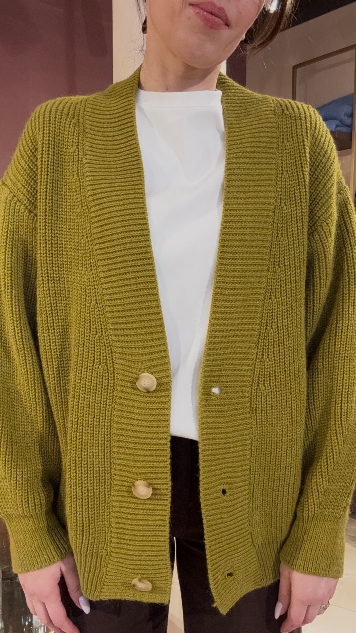 Šis klasikinio silueto kardiganas išsiskiria savo ryškia pistacine spalva ir subtilia faktūra. Megztas, malonus liesti audinys suteikia jaukumo pojūtį, o laisvas kirpimas leidžia jaustis patogiai visą dieną.