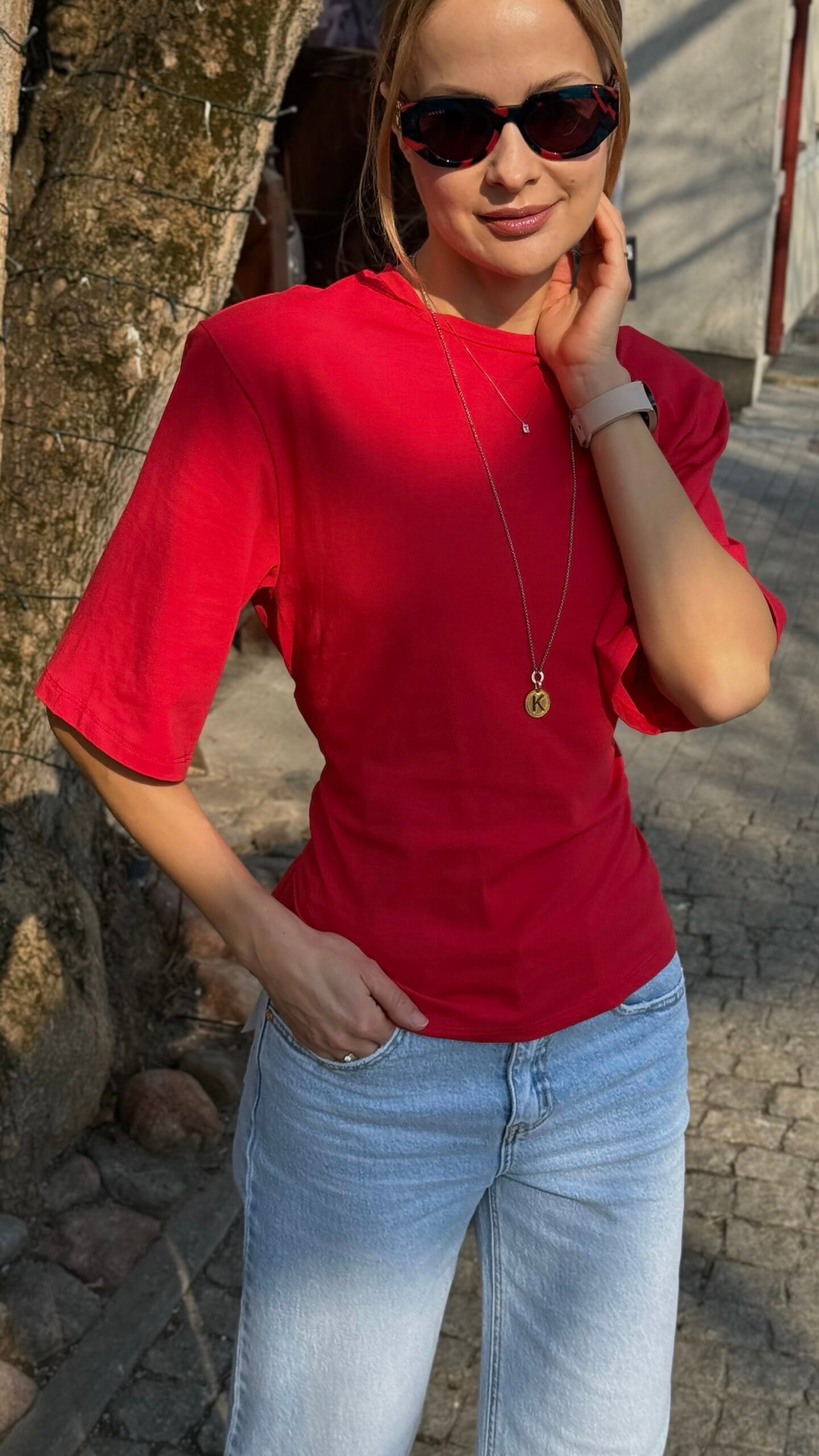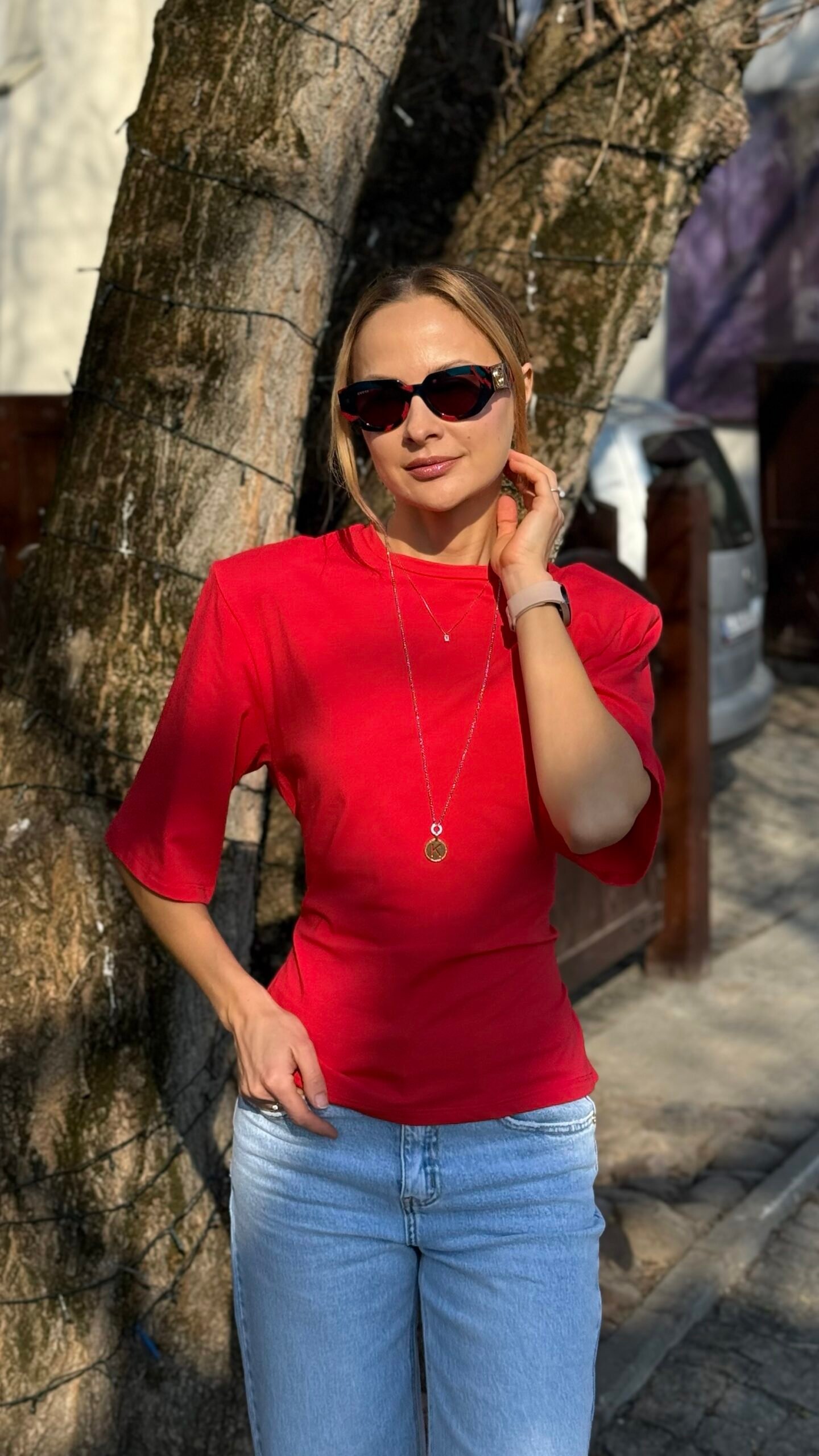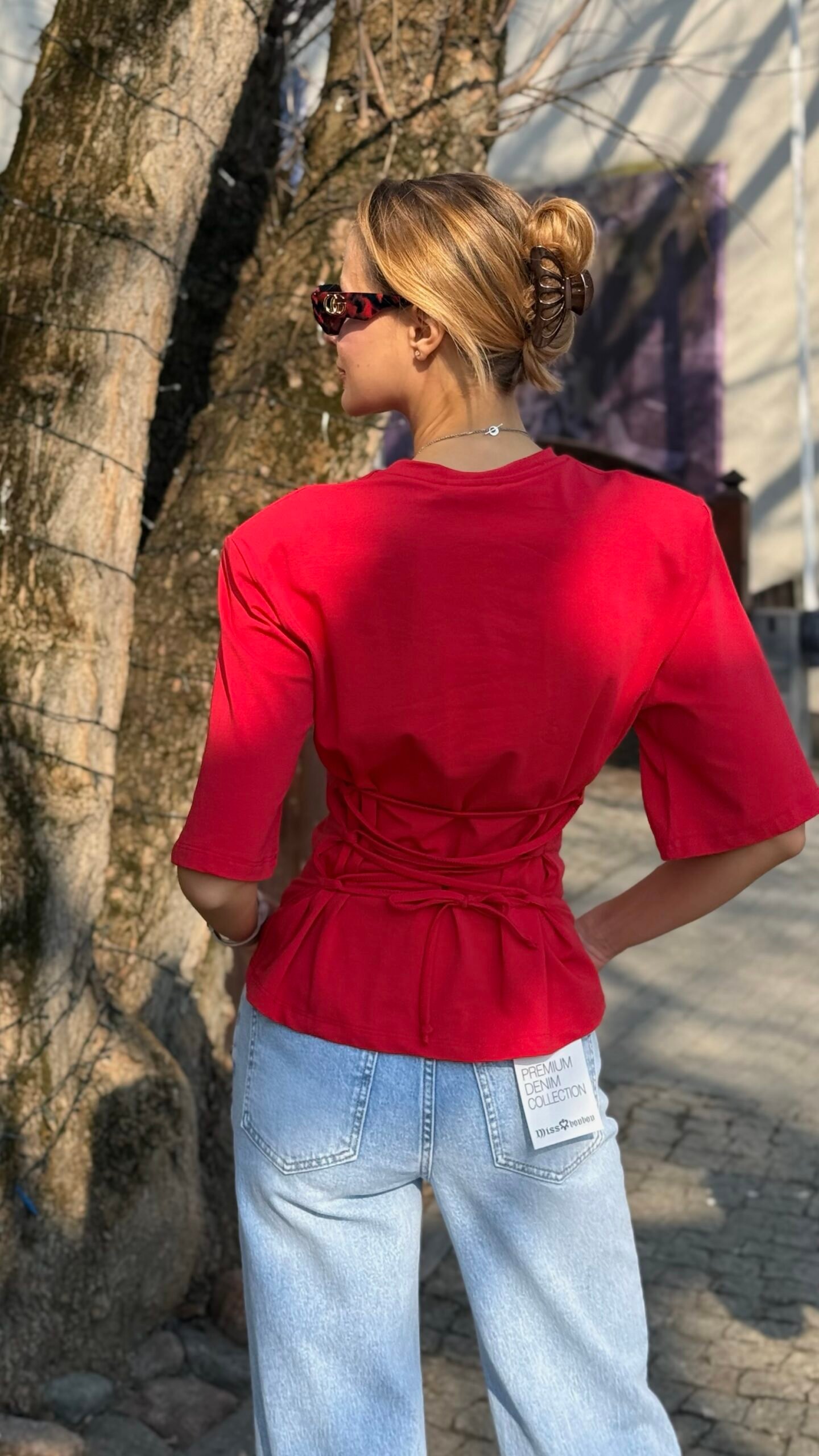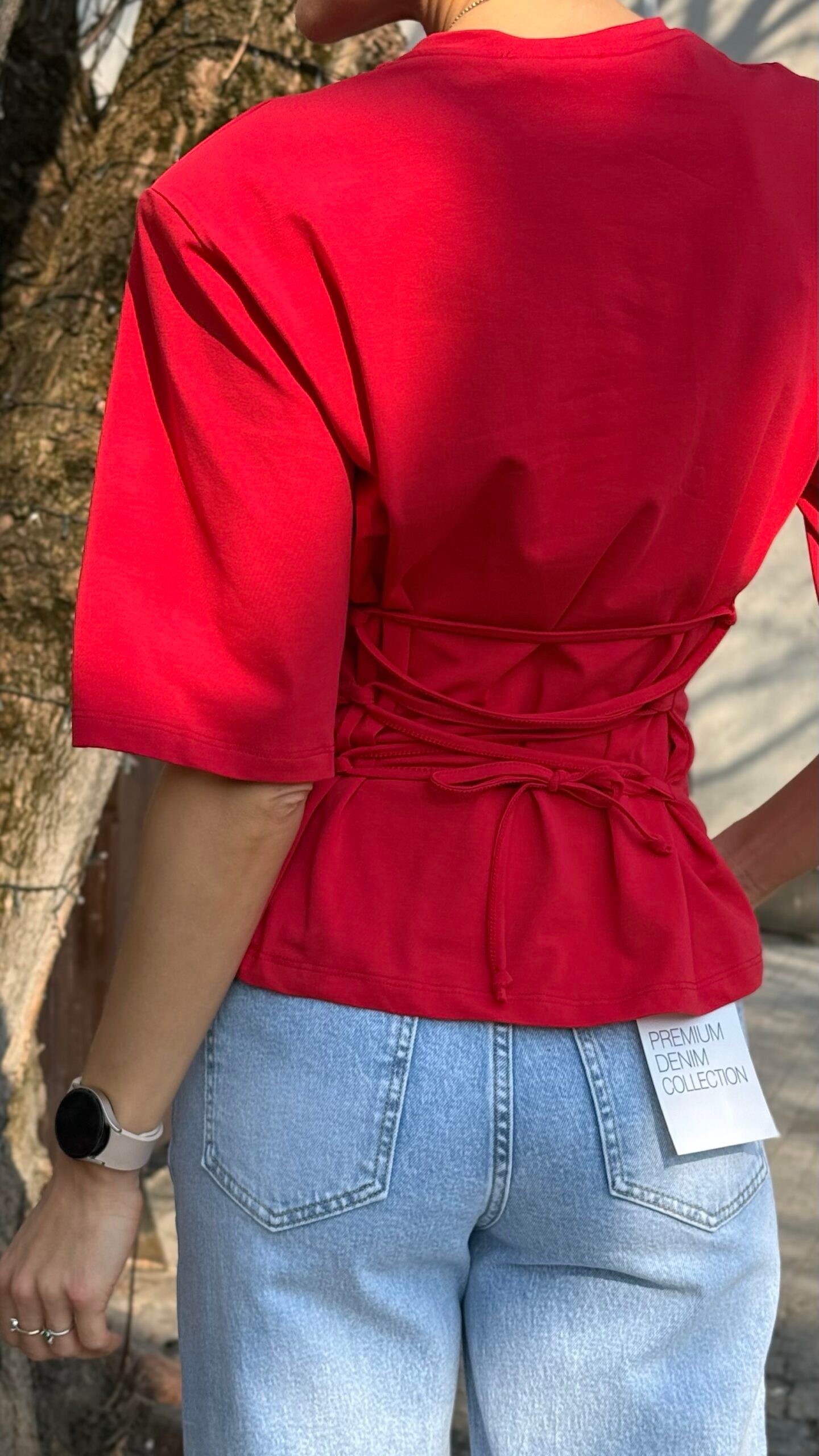 Ryški, sodri raudona spalva ir modernus siluetas – trumpa palaidinė su ¾ rankovėmis, suvarstoma per liemenį virvele, kuri gražiai suformuoja figūrą. Minkštas, elastingas audinys maloniai priglunda. Puikiai atrodo su aukšto liemens džinsais, plačiomis kelnėmis ar sijonu – lengvai pereina iš kasdienybės į vakarinį įvaizdį. Raišteliai nugaroje reguliuojasi pagal jūsų norus.