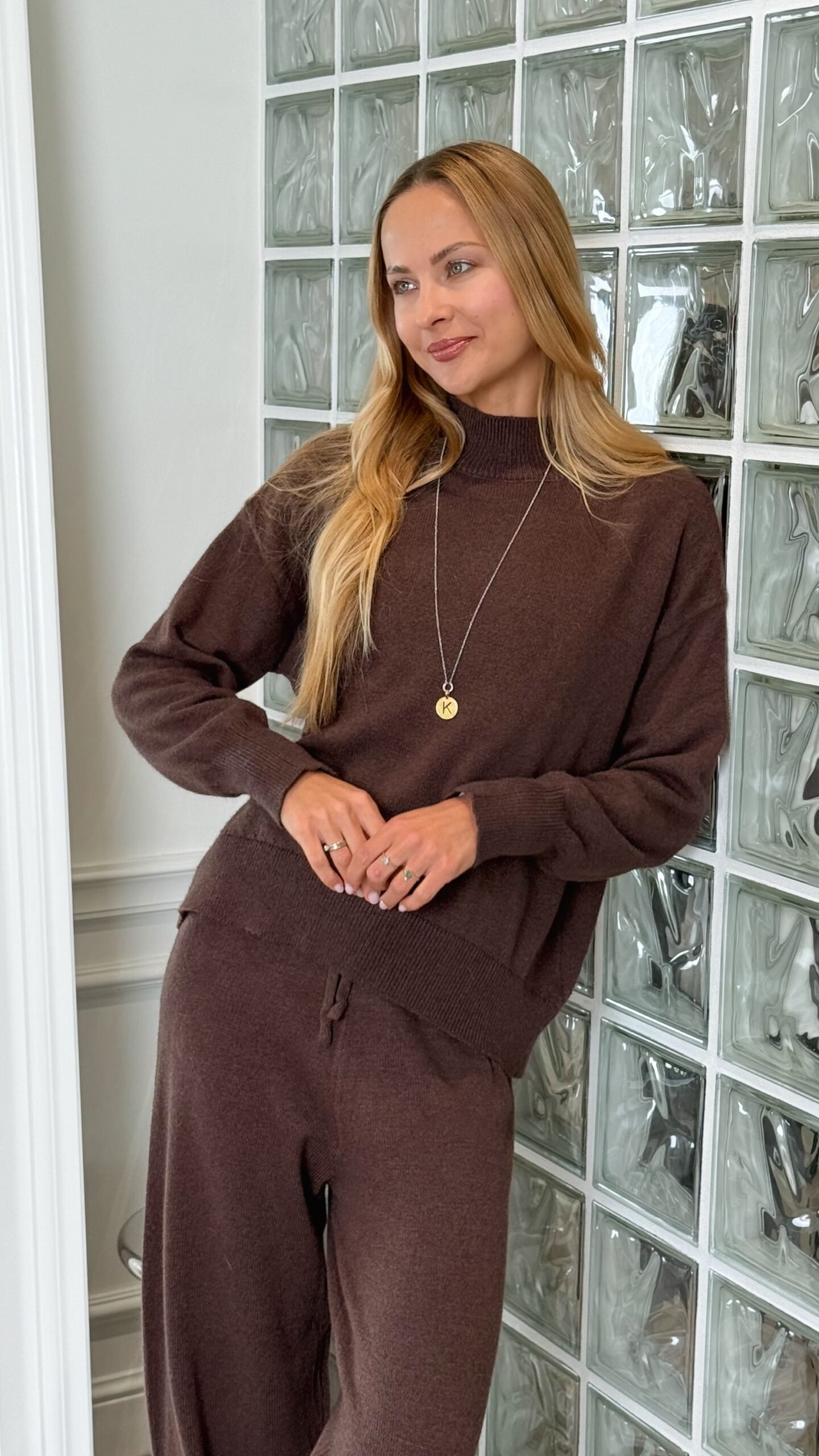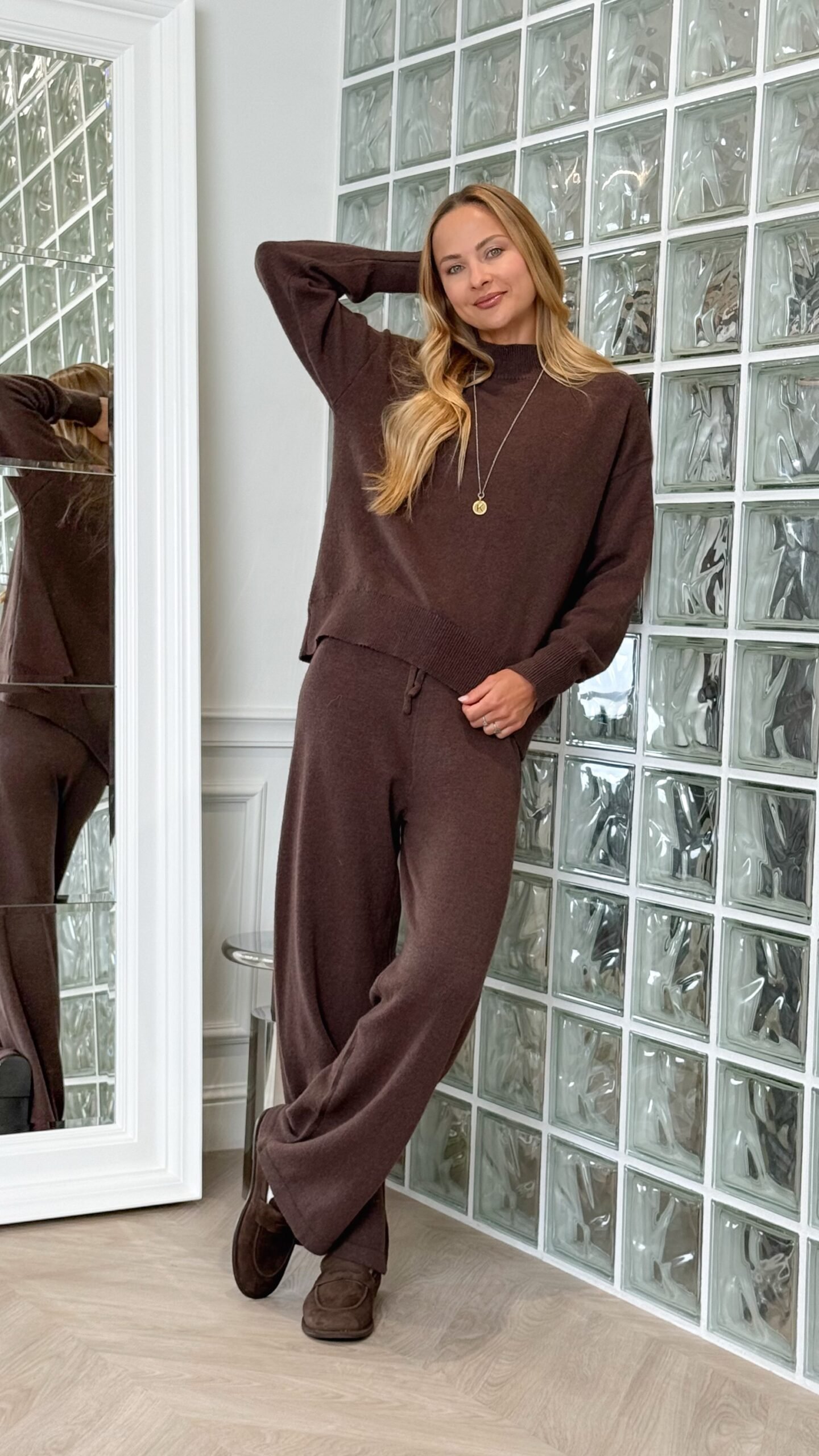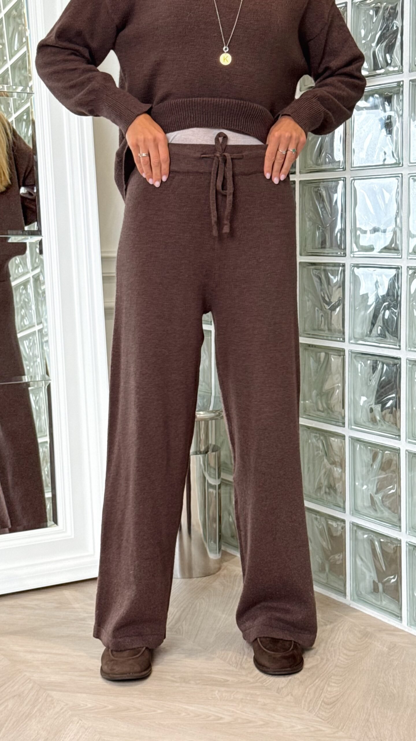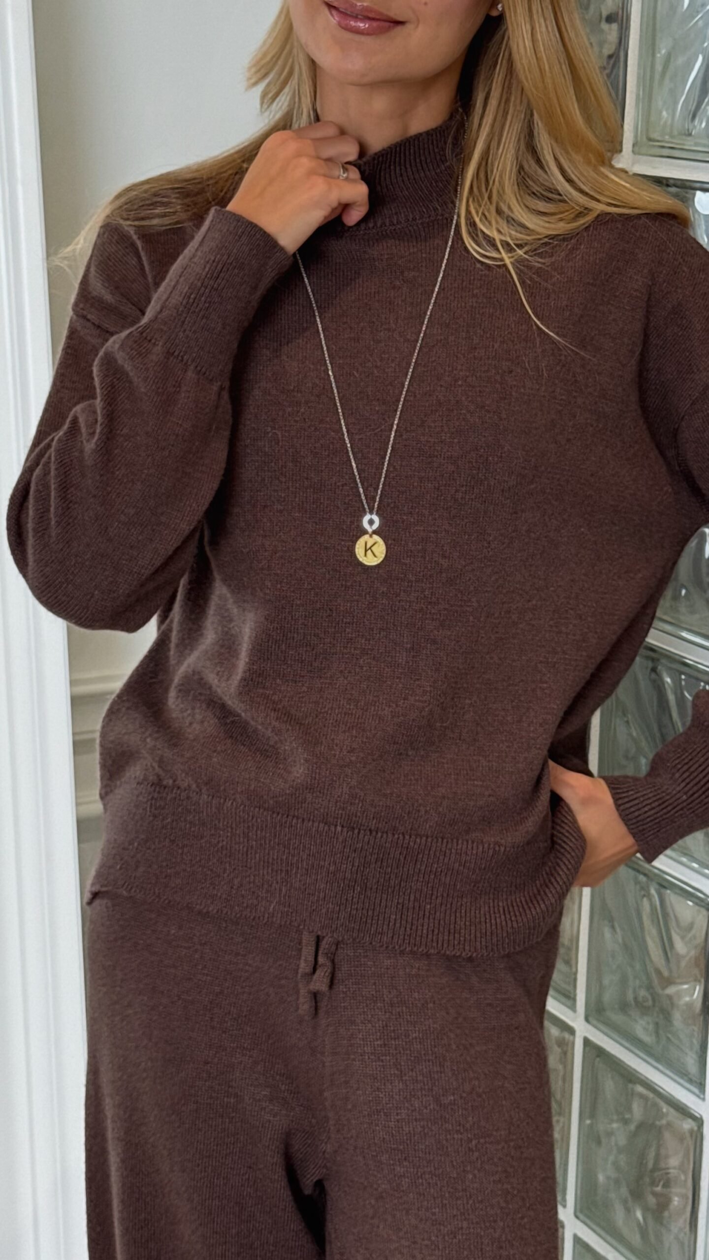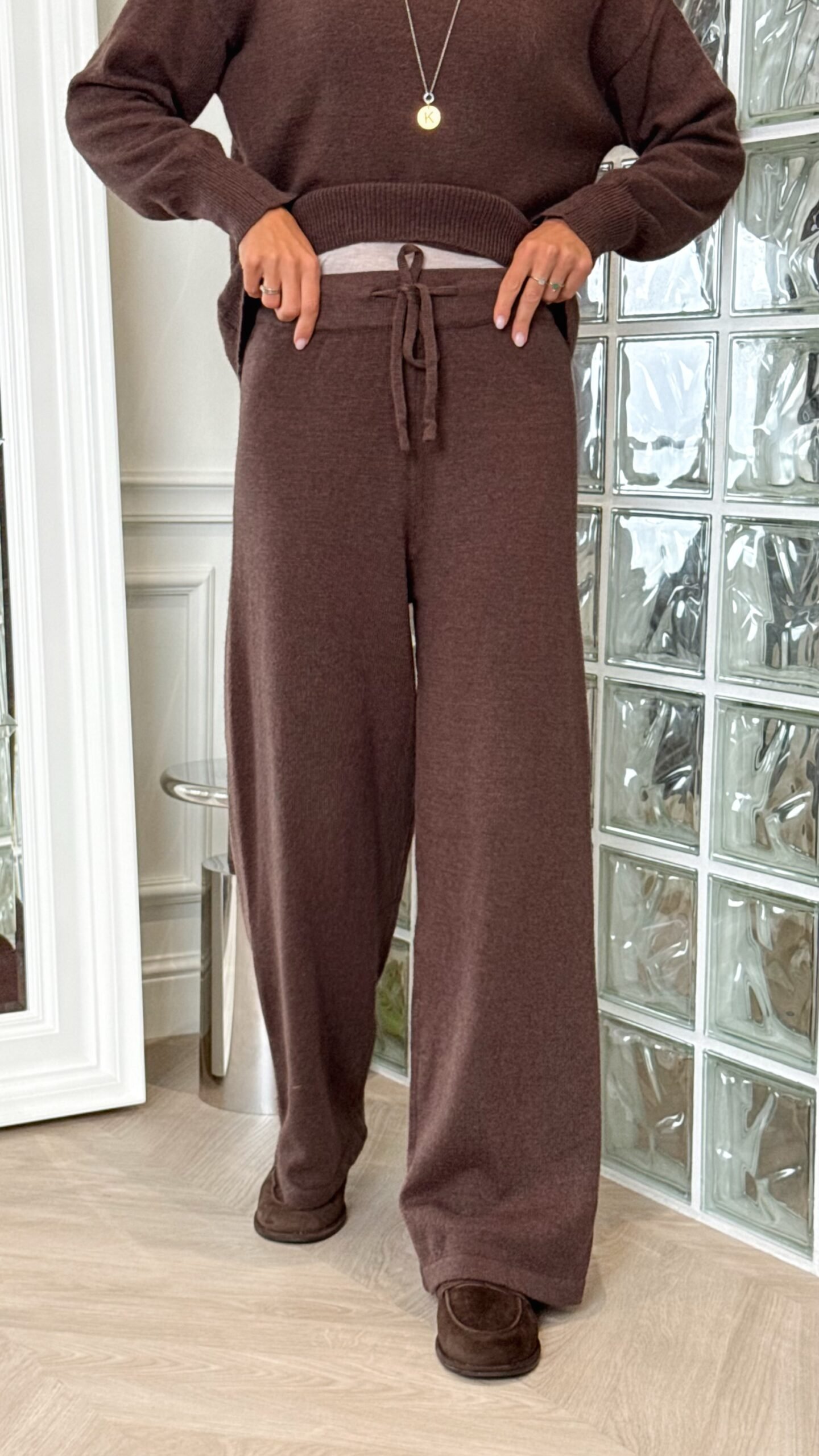 Viršutinė dalis – laisvo kirpimo megztinis su pusaukšte apykakle ir patogiais rankogaliais. Kelnės – plačios, su raišteliu liemens srityje, užtikrinančiu komfortą ir tobulą prigludimą.