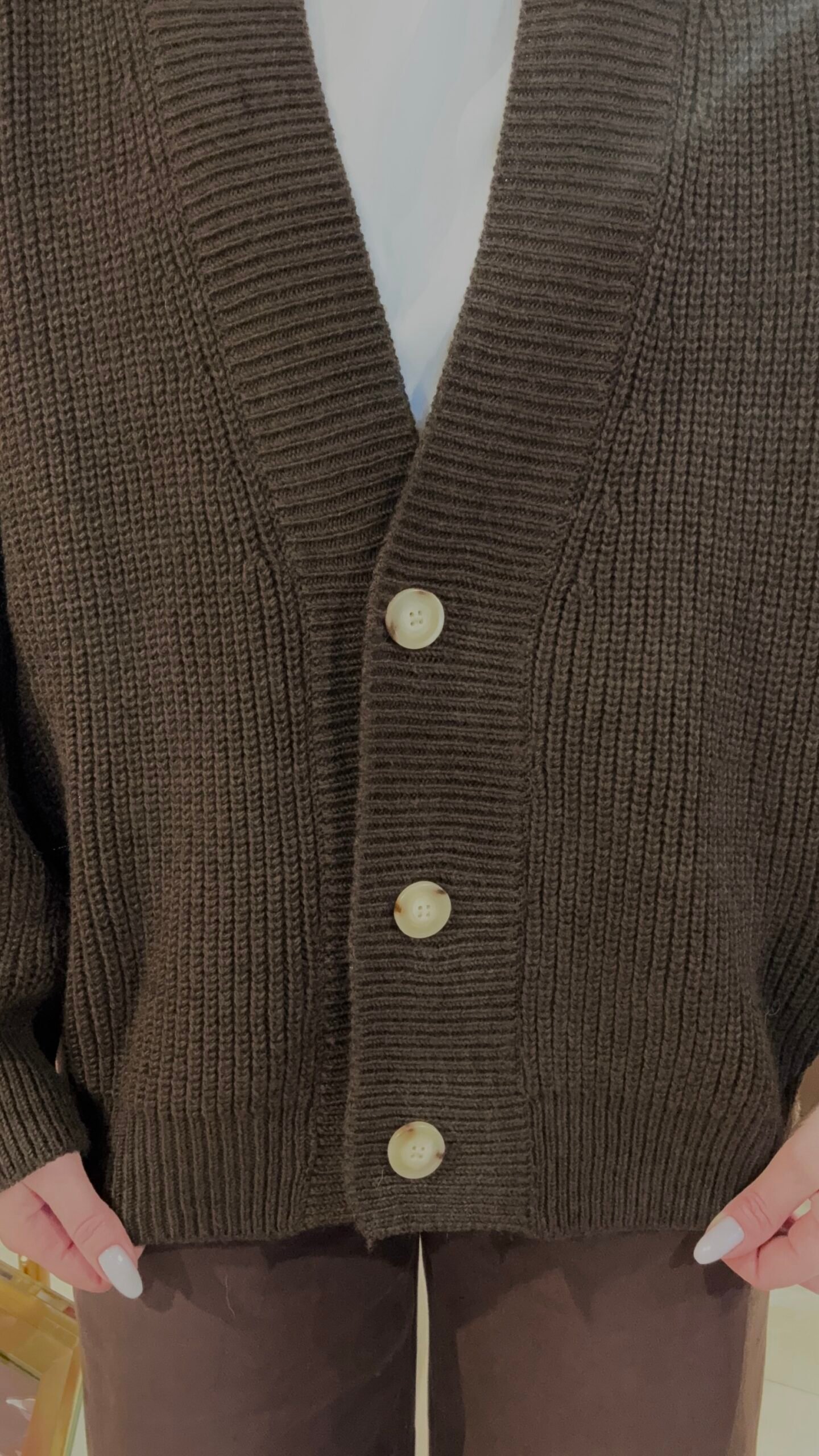 Šis klasikinio silueto kardiganas išsiskiria savo ryškia šokoladine spalva ir subtilia faktūra. Megztas, malonus liesti audinys suteikia jaukumo pojūtį, o laisvas kirpimas leidžia jaustis patogiai visą dieną.