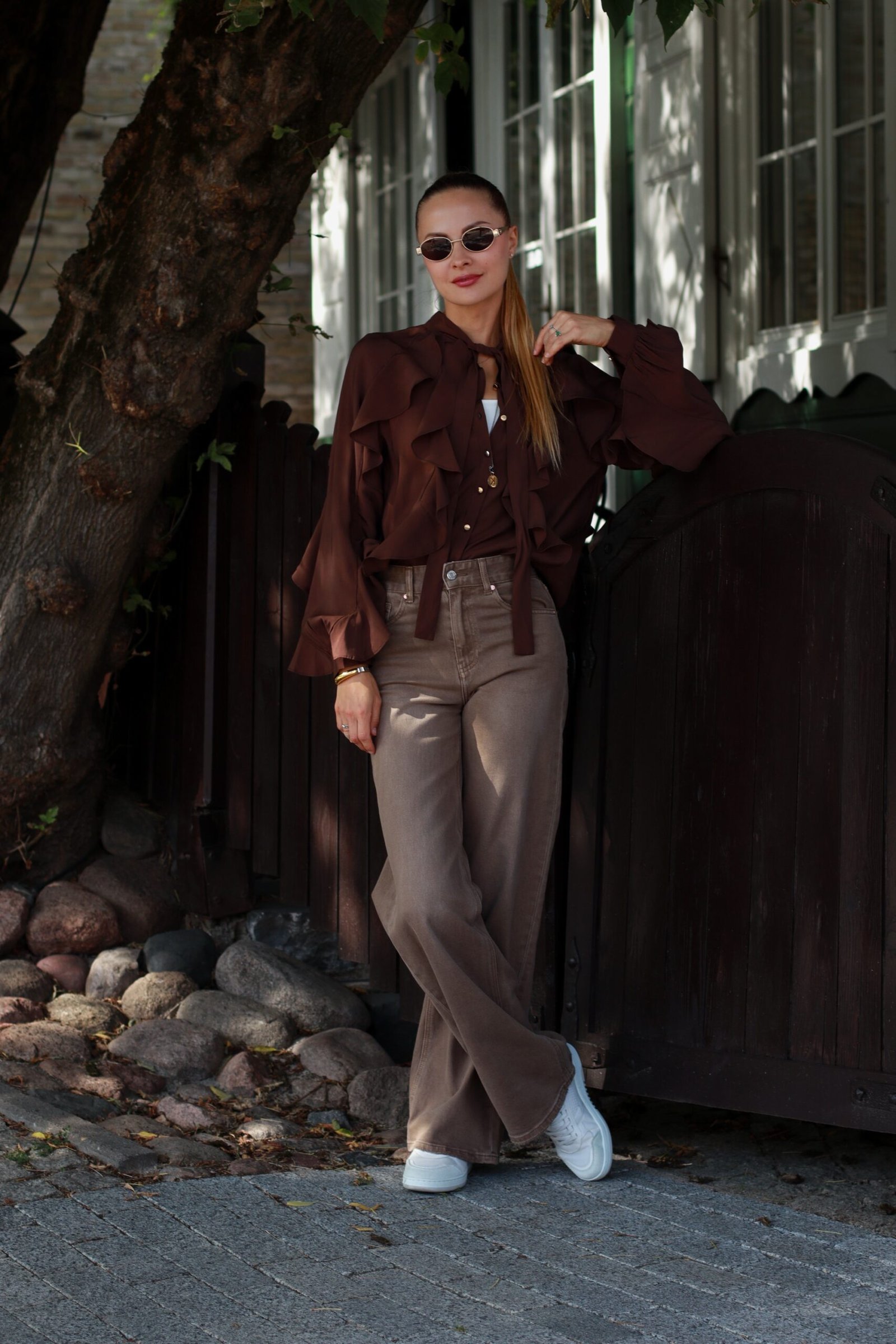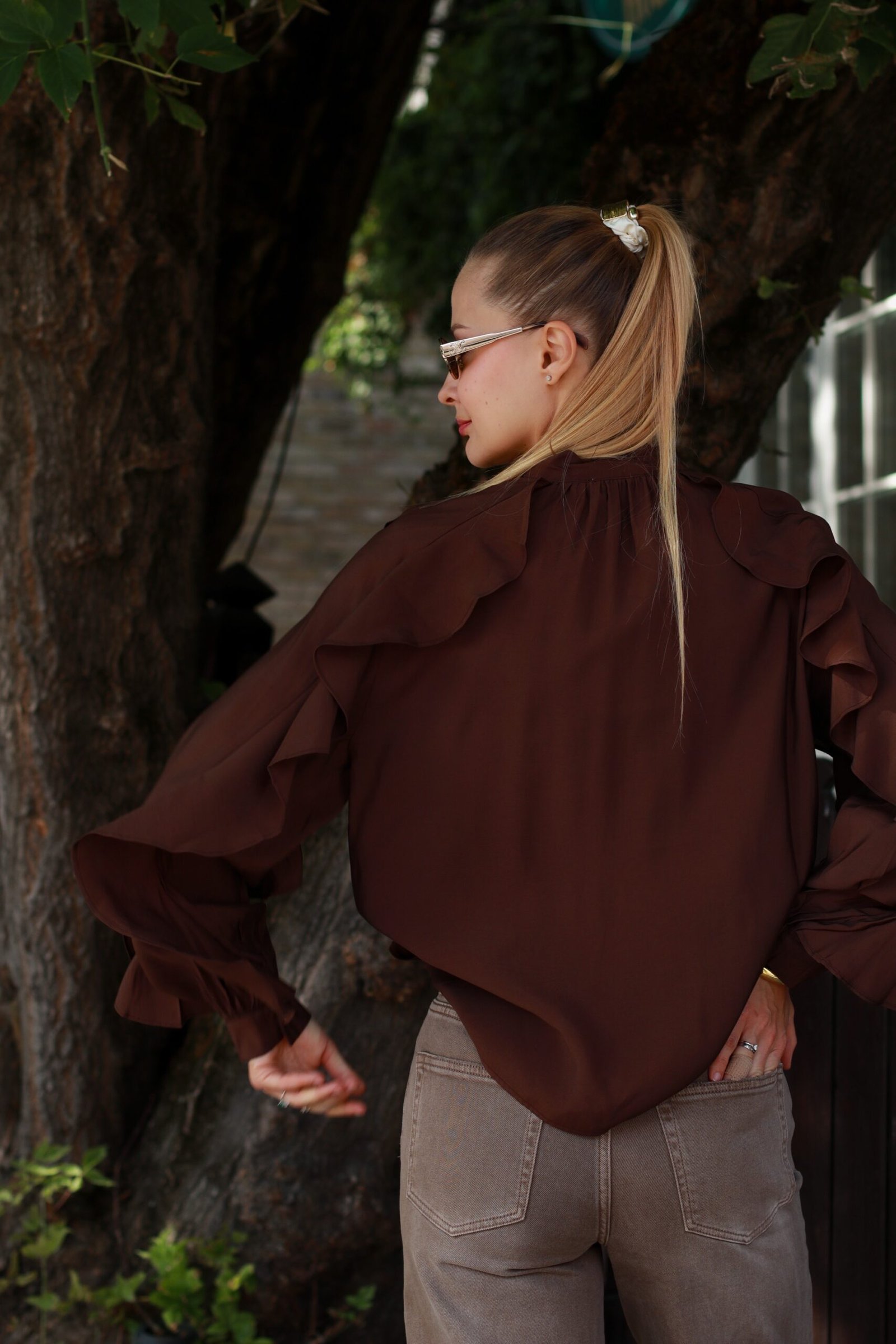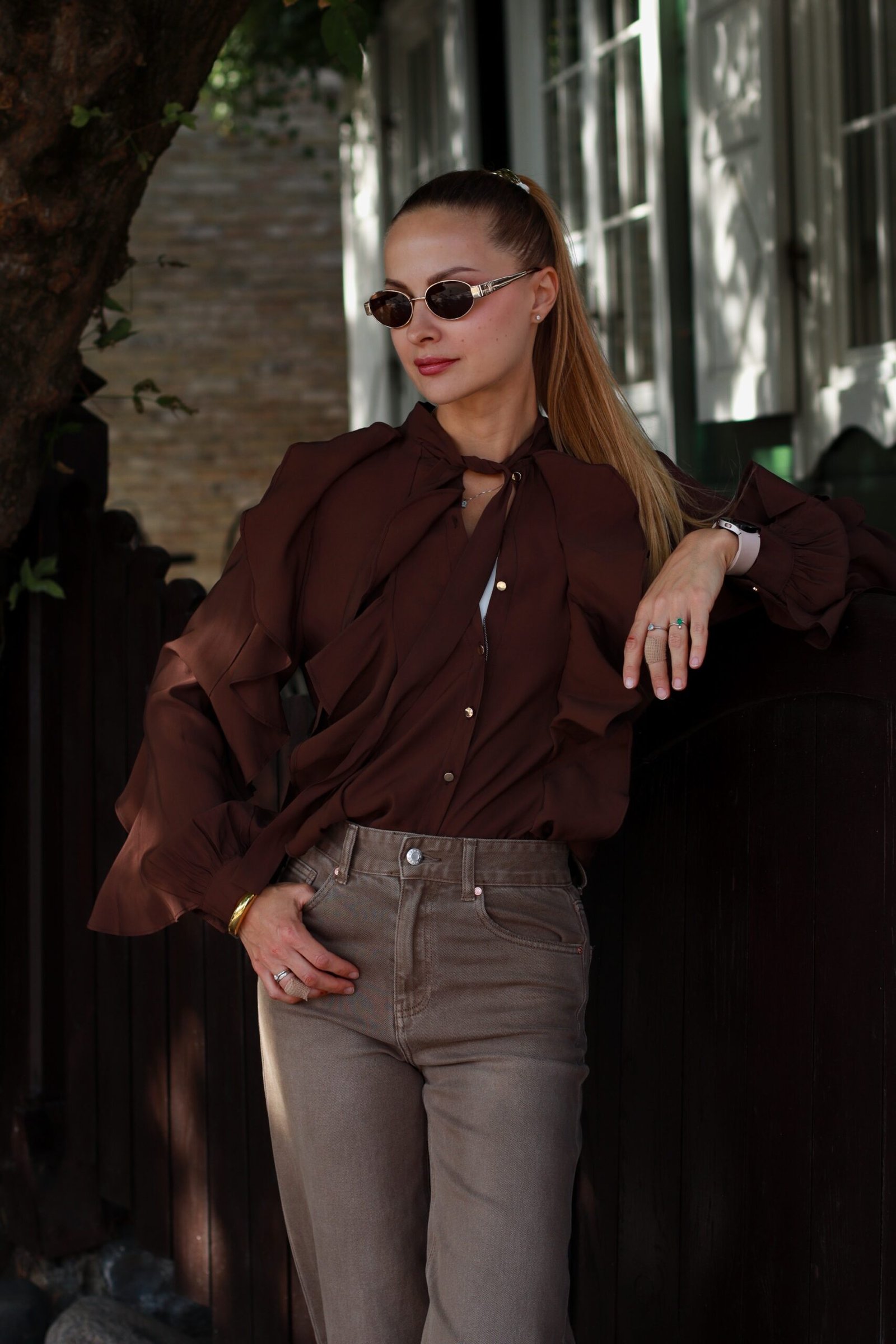 Ši šokolado spalvos palaidinė – išskirtinis stiliaus ir elegancijos derinys. Lengvai krintantis audinys subtiliai priglunda prie kūno, o gausūs raukiniai priekyje ir ant rankovių suteikia romantiško žavesio. Kaklo srityje esantis surišamas kaspinas leidžia reguliuoti iškirptės gylį ir pritaikyti įvaizdį skirtingoms progoms.