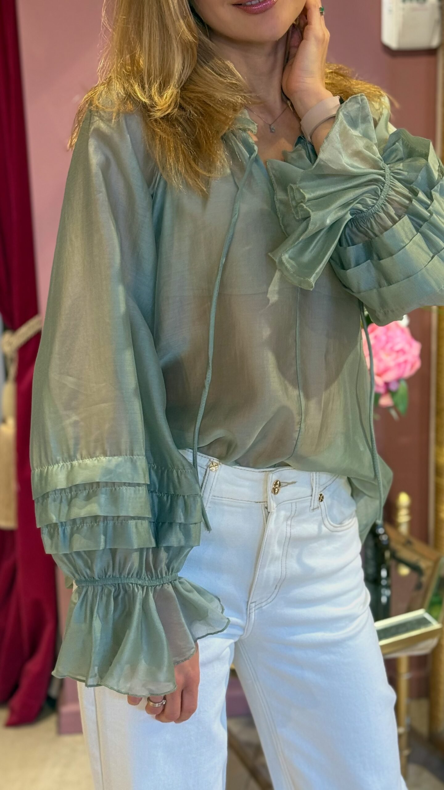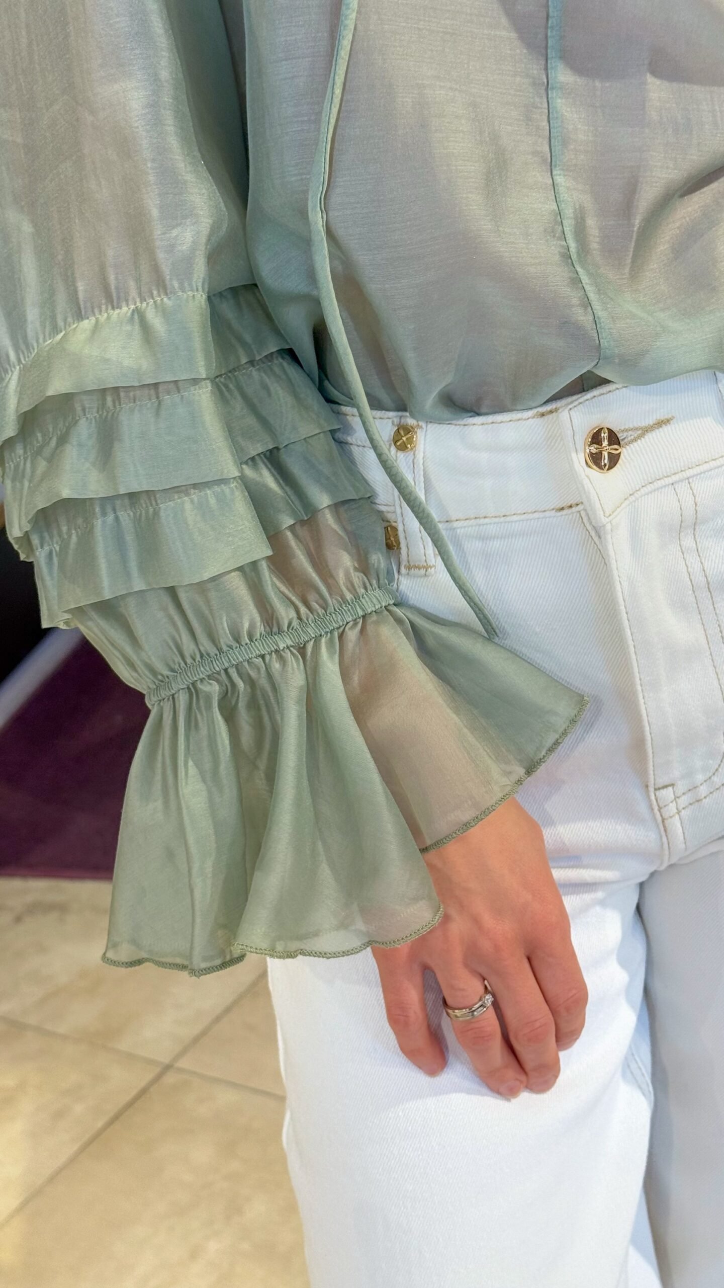 Lengvo audinio palaidinė švelniai žalioje spalvoje. Gražiai surišamas kaklas su raišteliu, laisvas kirpimas ir išskirtinės rankovės su kelių lygių volanais – tai pagrindinis akcentas. Audinys lengvas ir švelniai blizga, puikiai krenta ant kūno.