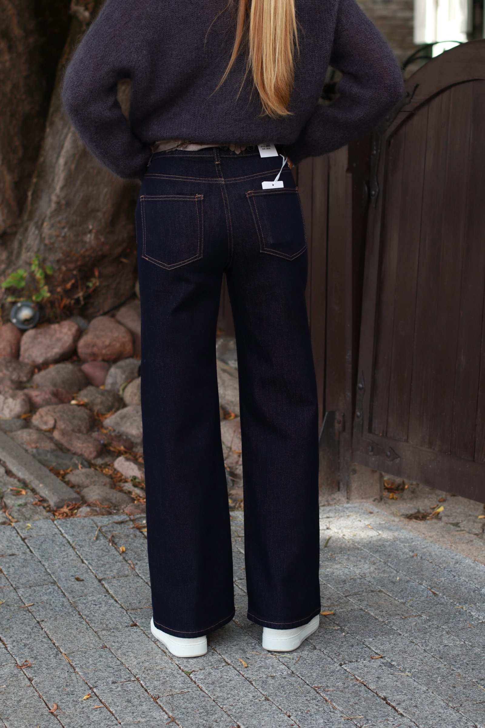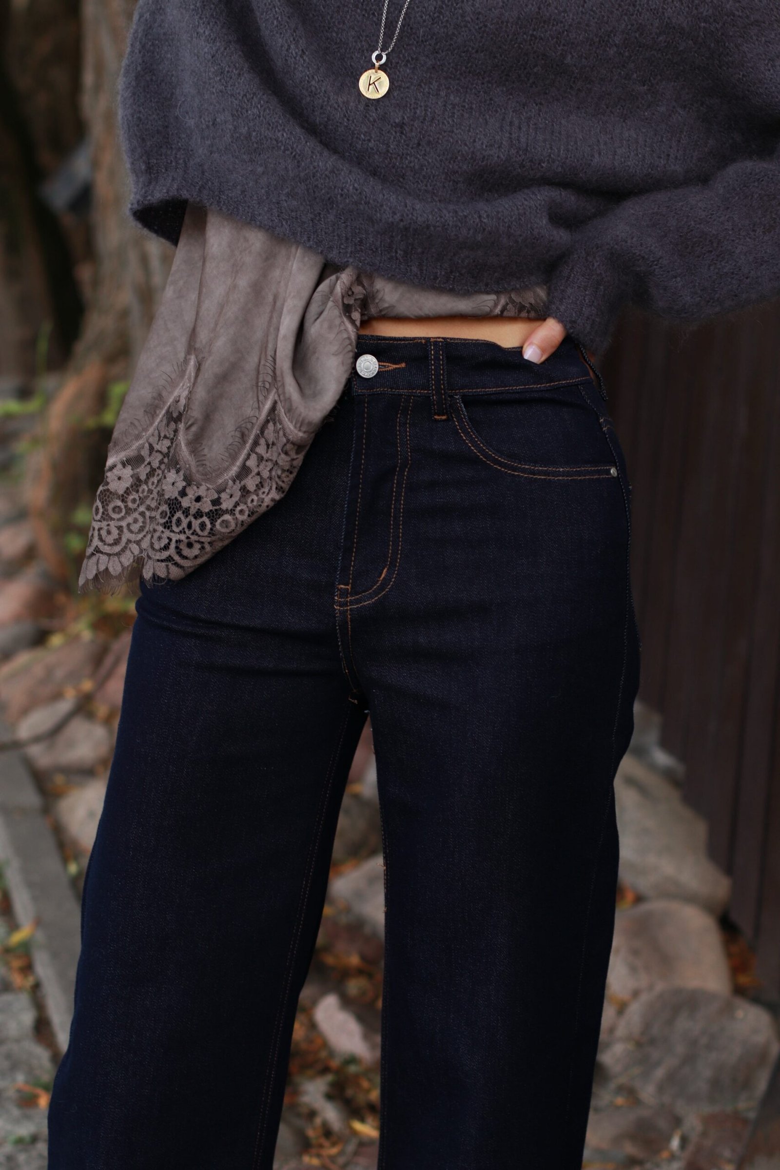 Šie džinsai – tobula bazė jūsų kasdieniams deriniams. Tamsiai mėlyna („dark denim“) spalva suteikia elegancijos, o tiesaus, šiek tiek platėjančio silueto modelis vizualiai ilgina kojas ir leidžia jaustis itin patogiai. Aukštas liemuo pabrėžia figūrą, o klasikinės kišenės bei kontrastingos siūlės suteikia džinsams stilingo charakterio.